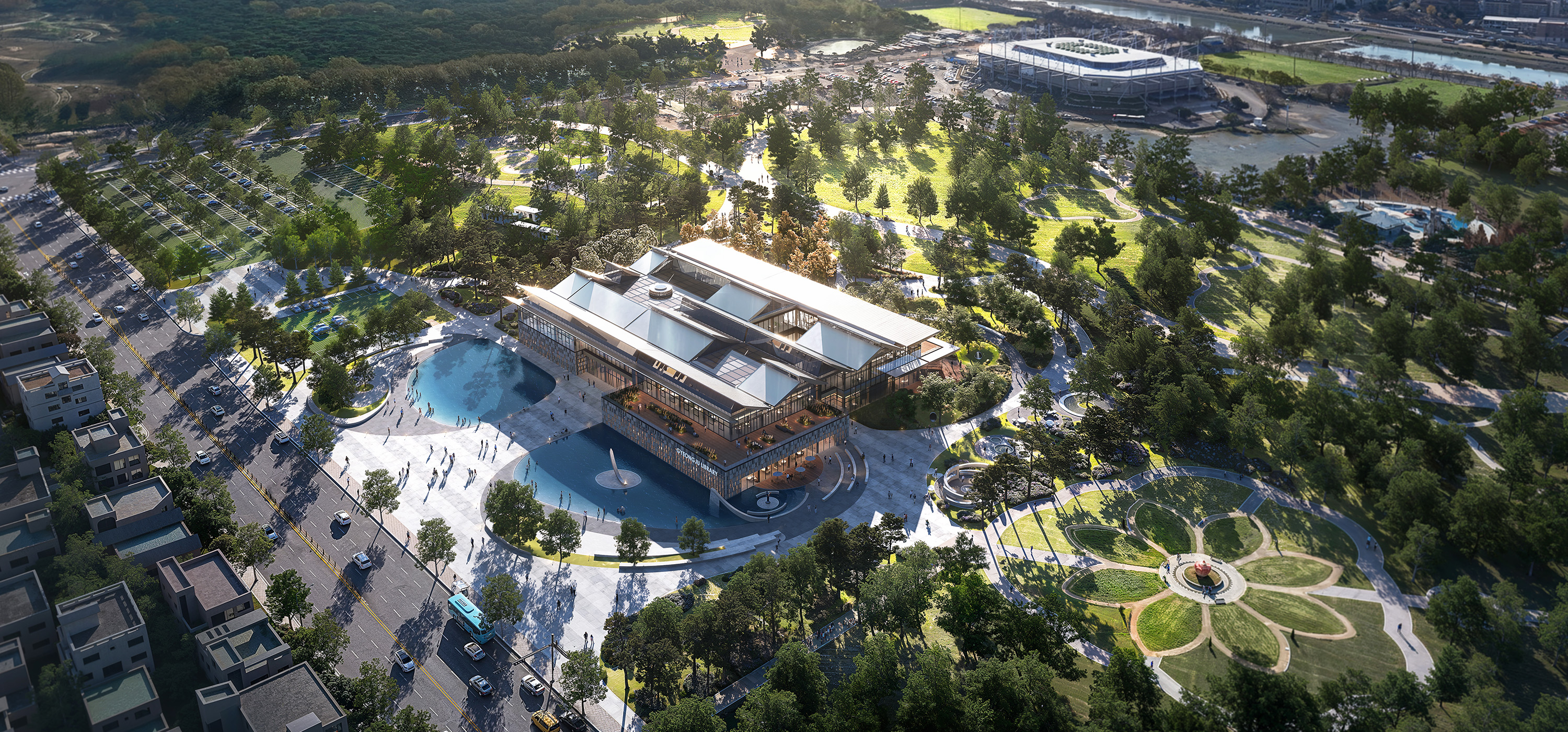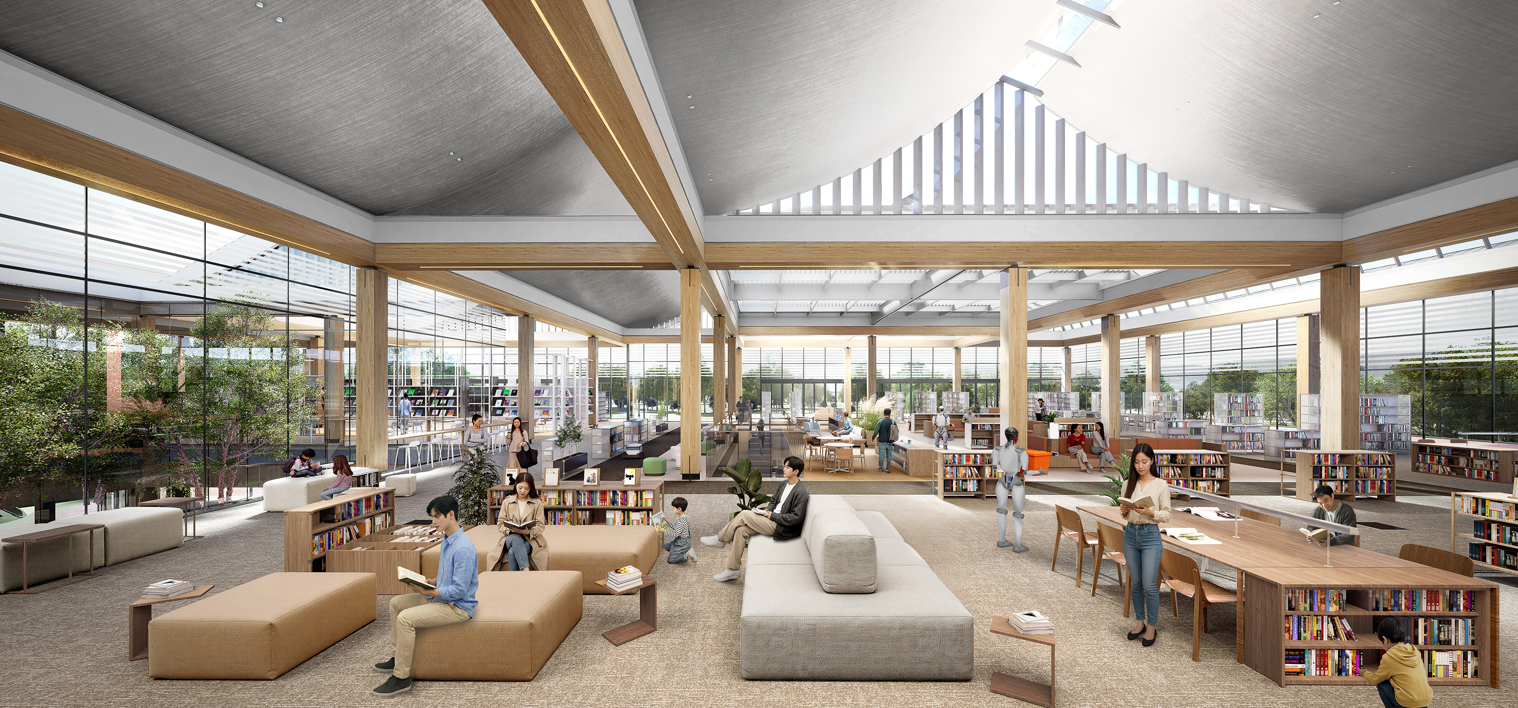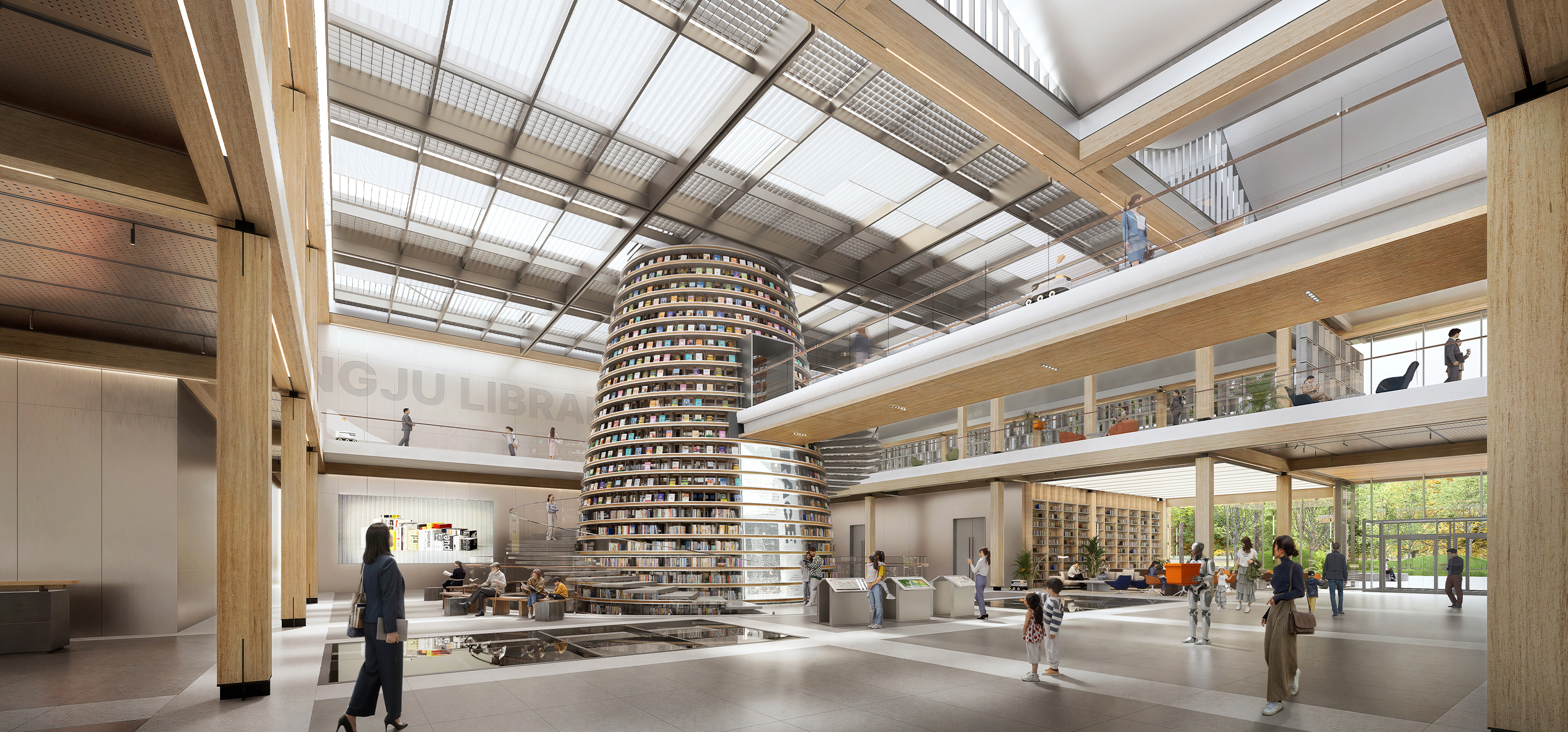 Gyeongju Integrated Cultural Library aims to redefine the library as a community platform where everyday life and culture intersect. Drawing on the concept of a “village,” the design creates an open spatial structure that invites citizens to freely enter and linger. The ground level integrates with the surrounding park and features Byeoldamteo, a central landmark Community space that organically connects cultural, educational, and exhibition programs. Above, an open-plan reading lounge overlooks Hwangseong Park, extending the relationship between nature and knowledge. In section, the layered composition—from historical archives to contemporary reading spaces and sustainable systems—expresses both Gyeongju’s sense of place and the library’s role as a complex cultural institution.