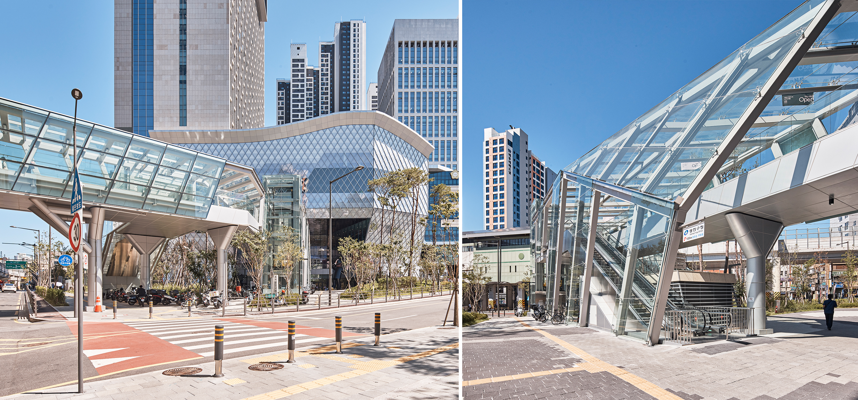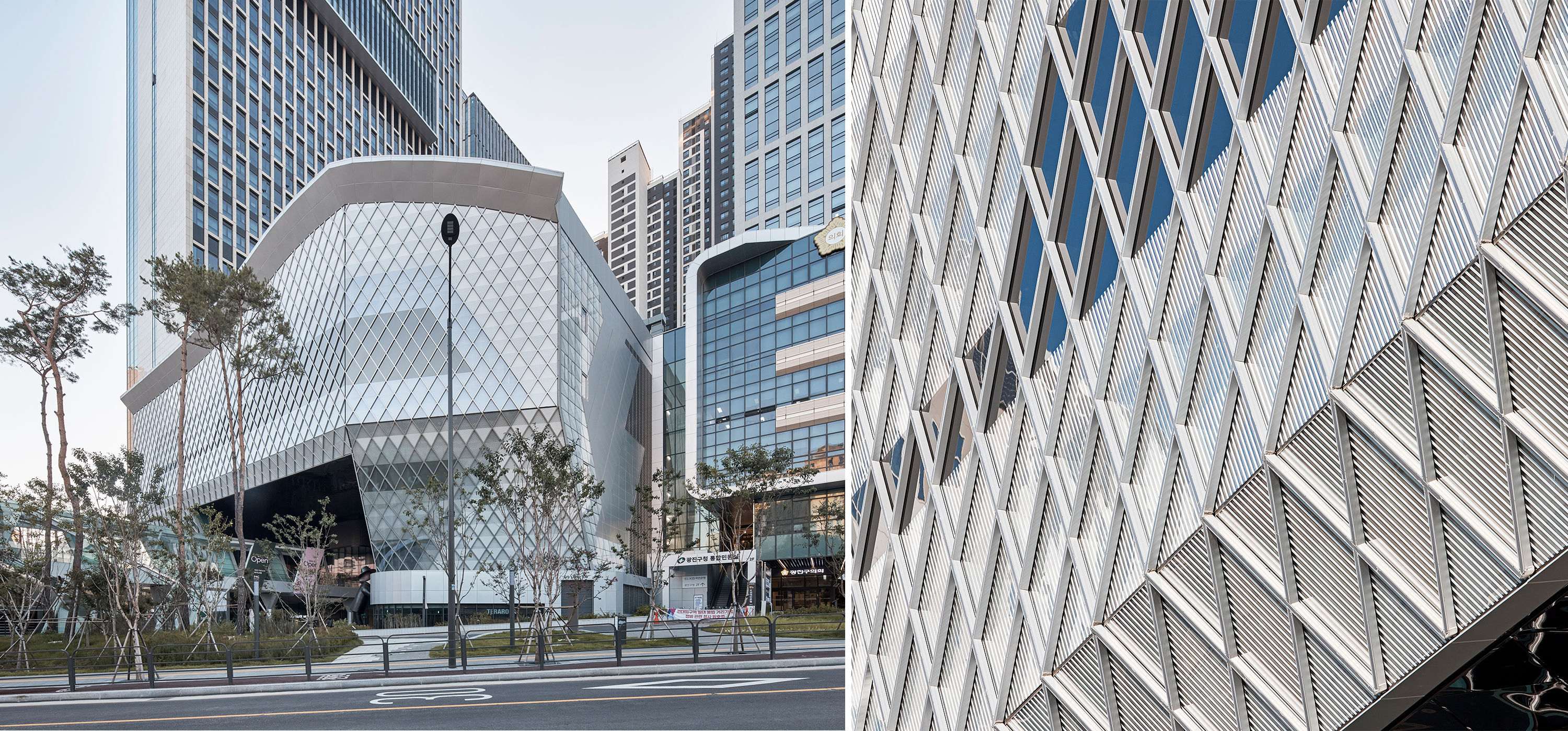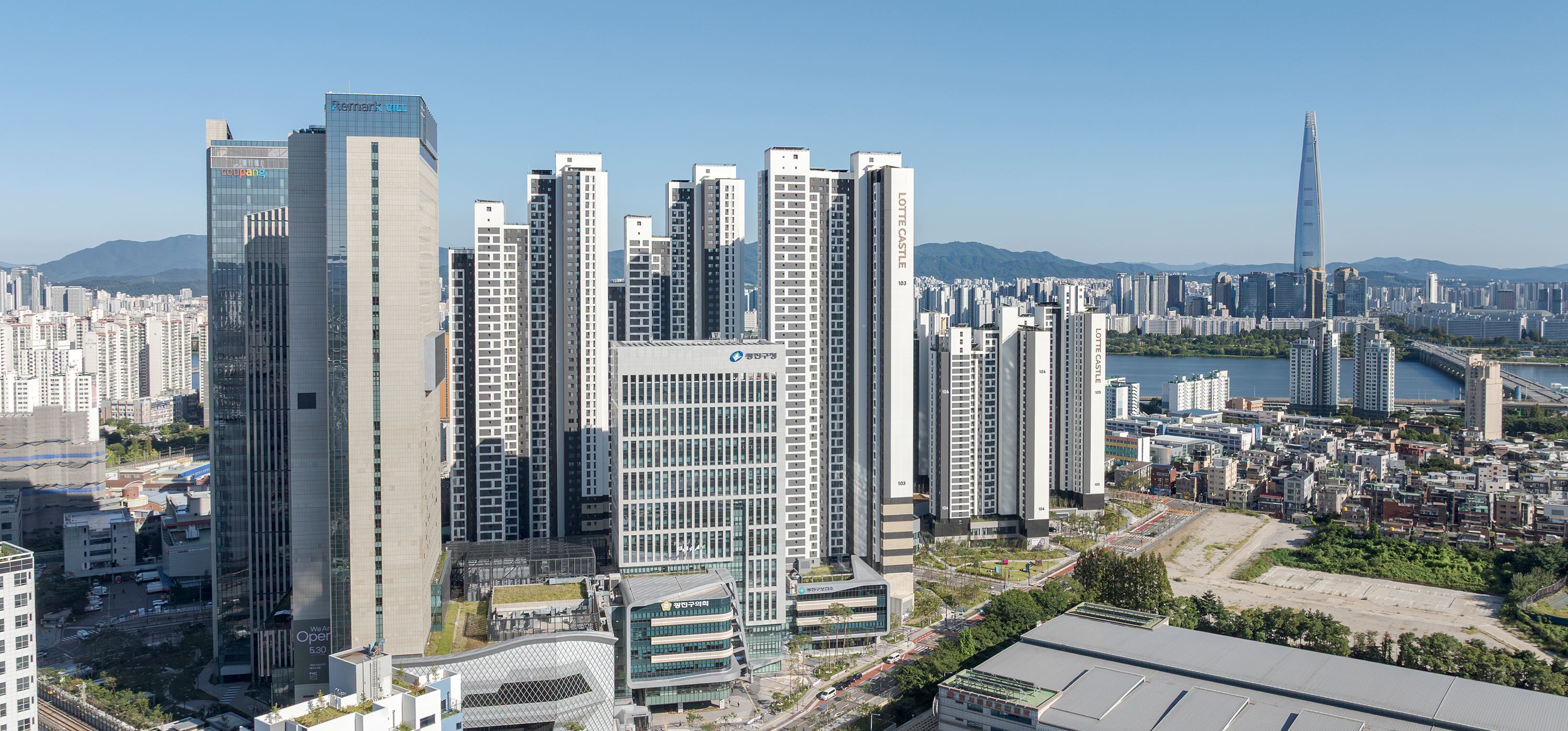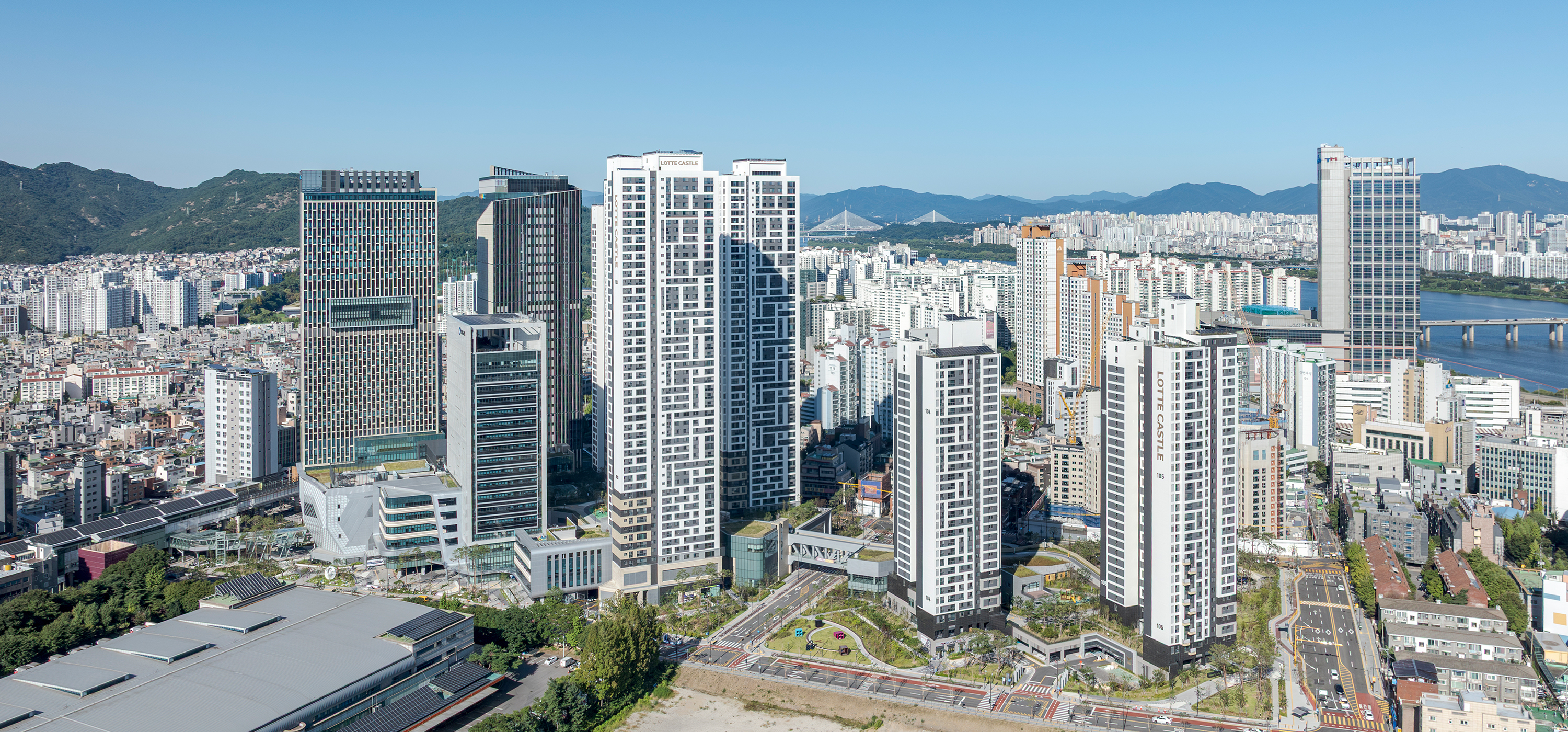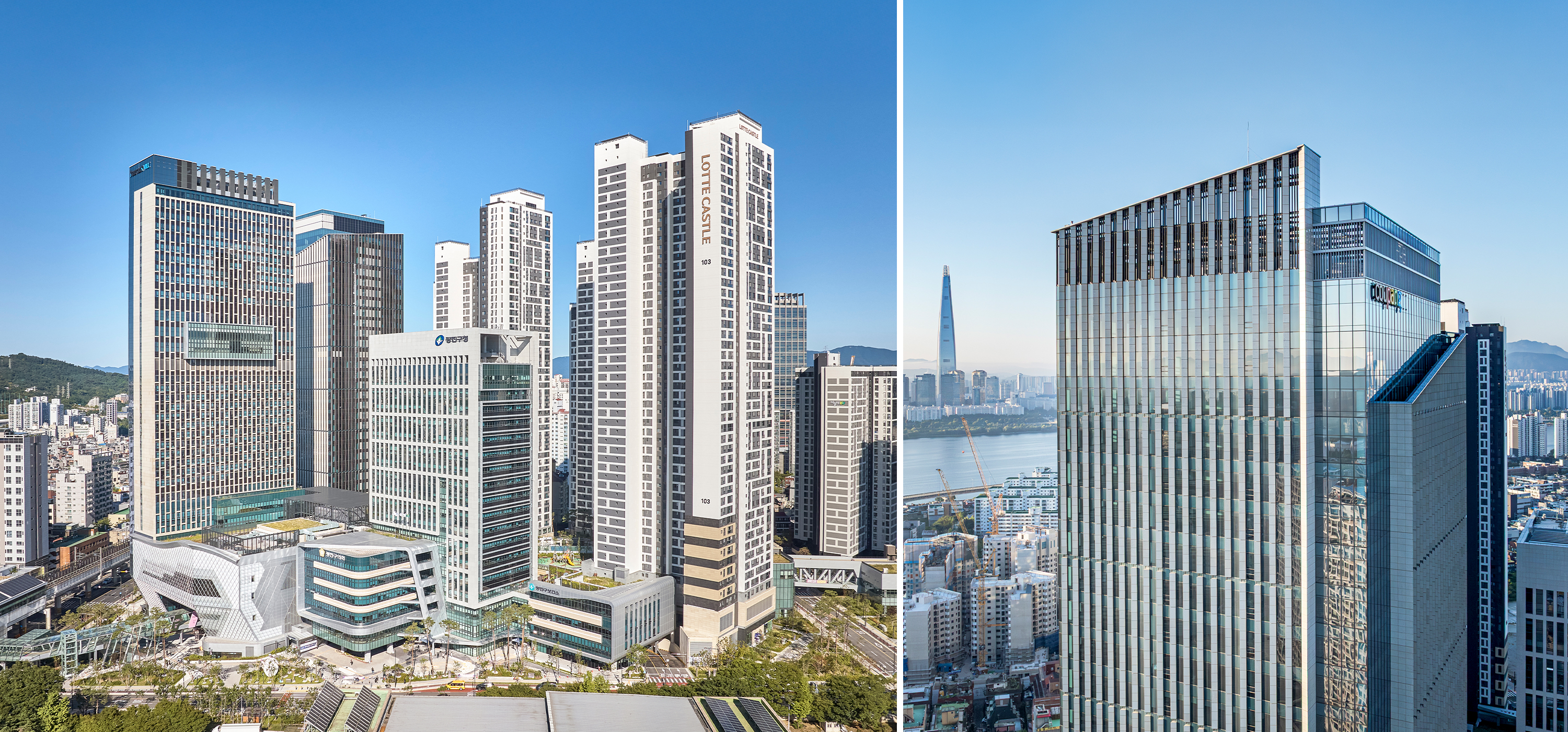 LOTTE CASTLE EASTPOLE & EASTPOLE Tower is a mixed-use development project initiated through public–private collaboration to revitalize a deteriorated urban environment. Located near Guui Station in Gwangjin-gu, the site enjoys views of the Han River to the south and Mountain Bukhansan and Achasan to the north. The design concept draws inspiration from the traditional baesanimsu (mountain-backed, water-facing). The high-rise towers form a backdrop within the complex, while the low-rise podium creates pedestrian-oriented internal passageways, shaping a new nature-friendly spatial environment. Despite its high-density mixed-use program, a 45-degree orientation was adopted to secure optimal views, openness, and a strong sense of frontage.