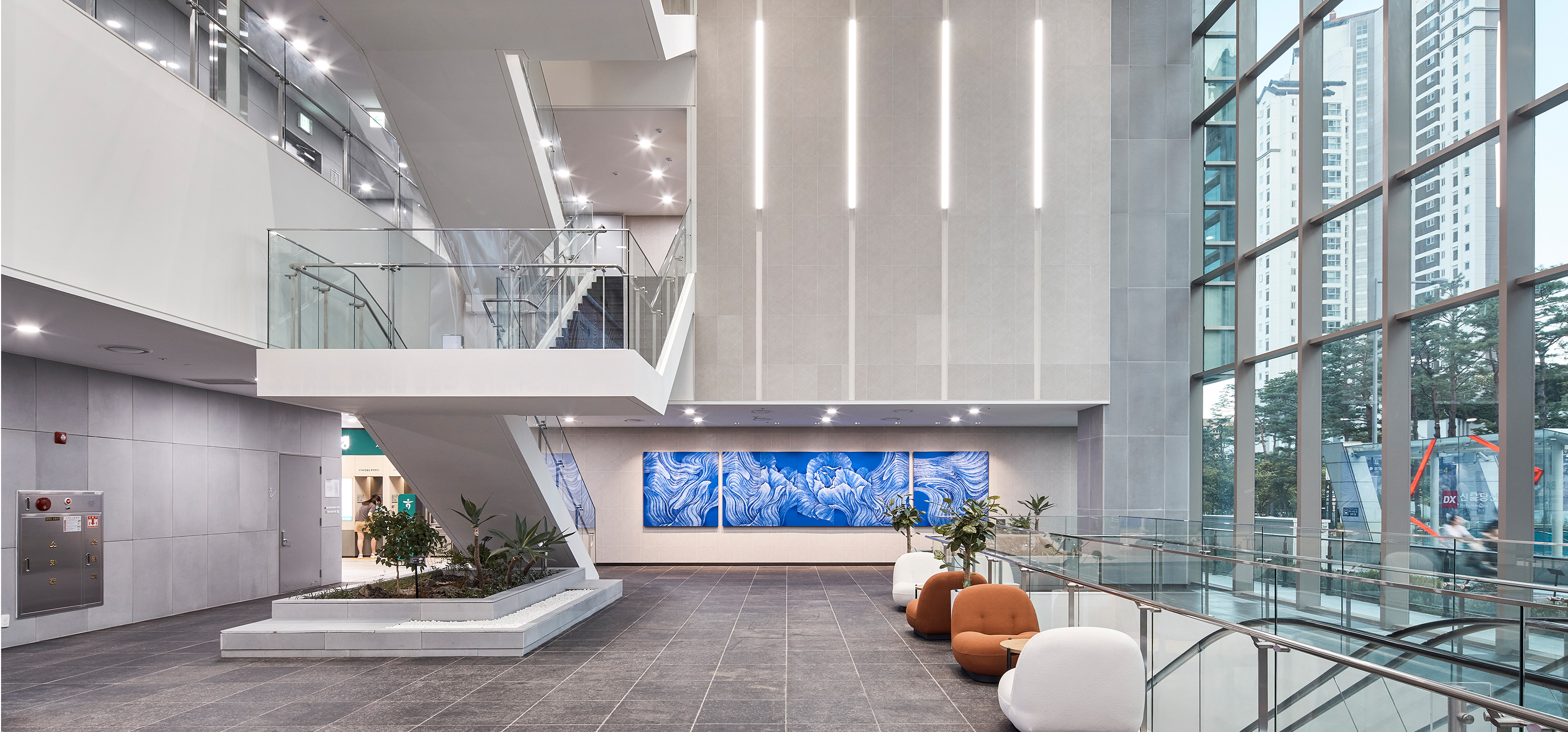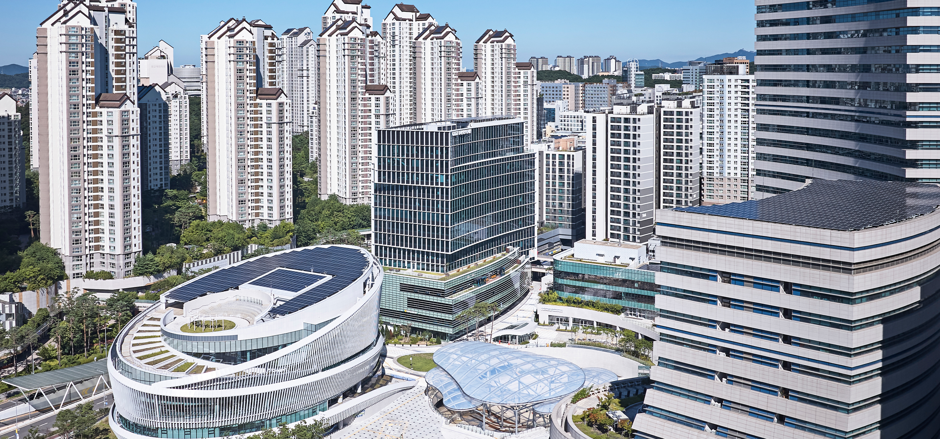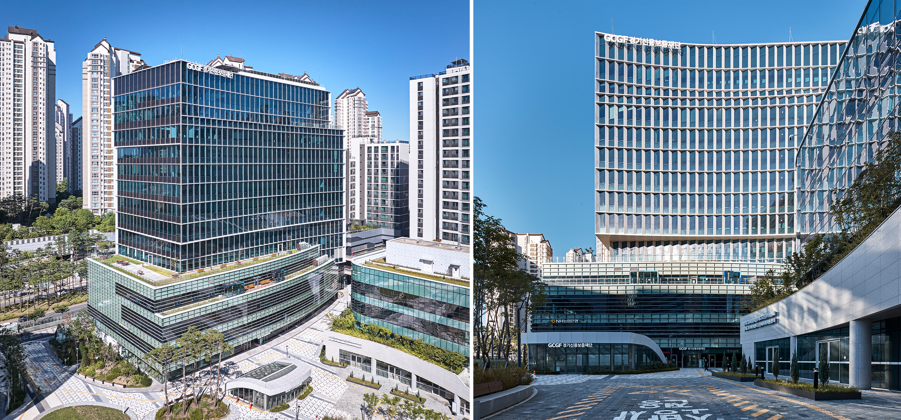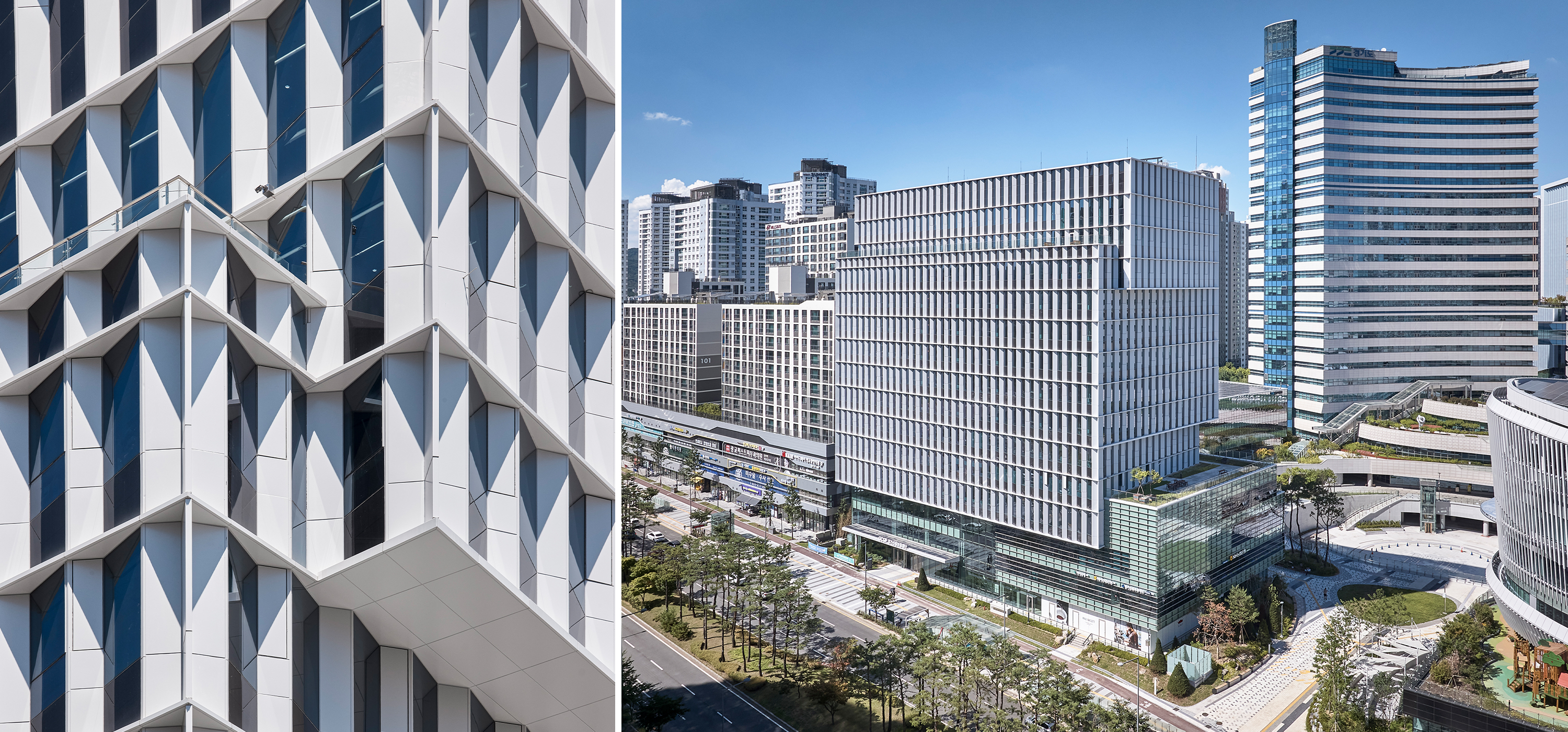 The headquarters of the Gyeonggi Credit Guarantee Foundation was designed in harmony with the Gyeonggi Convergence Town master plan. A gently curved base integrates pedestrian paths, retail, and plazas, creating a lively urban environment, while the tower’s curved form embraces the central square. The grand lobby connects directly to financial and start-up support programs, with terraces linked to amenities such as a café, restaurant, and fitness center, offering greenery and open views. Flexible, column-free office floors support a smart and adaptable workplace, and the serrated façade with BIPV panels enhances energy efficiency and sustainability.
