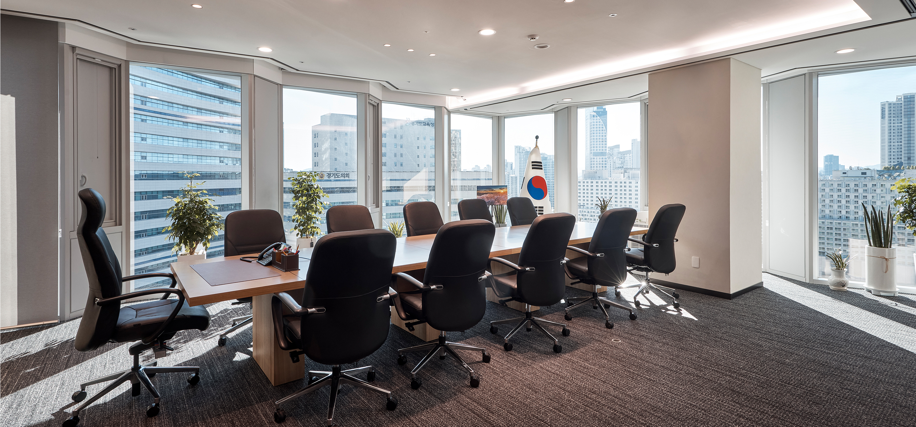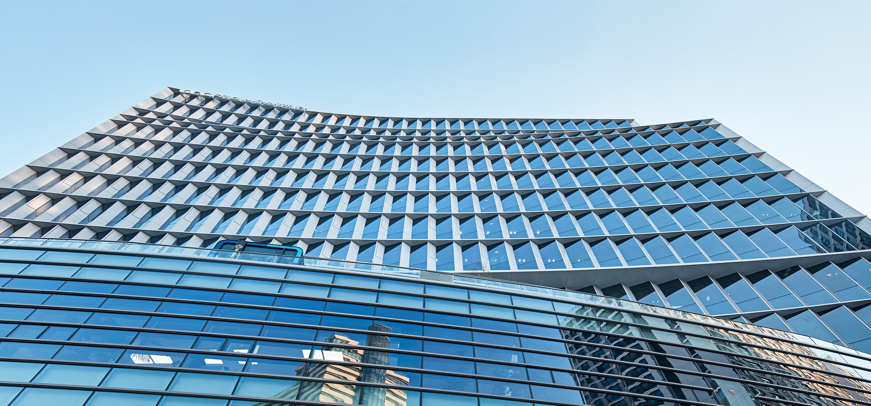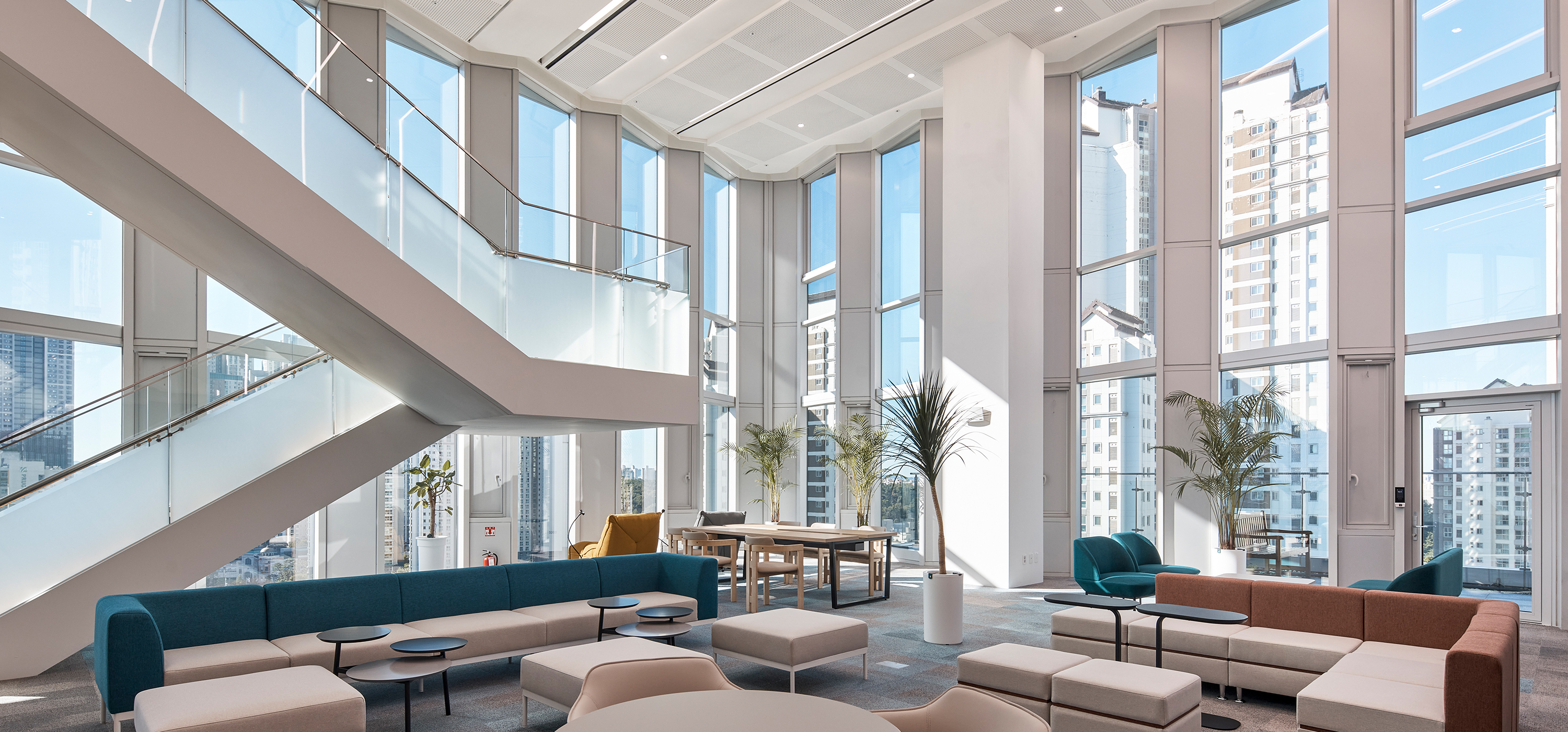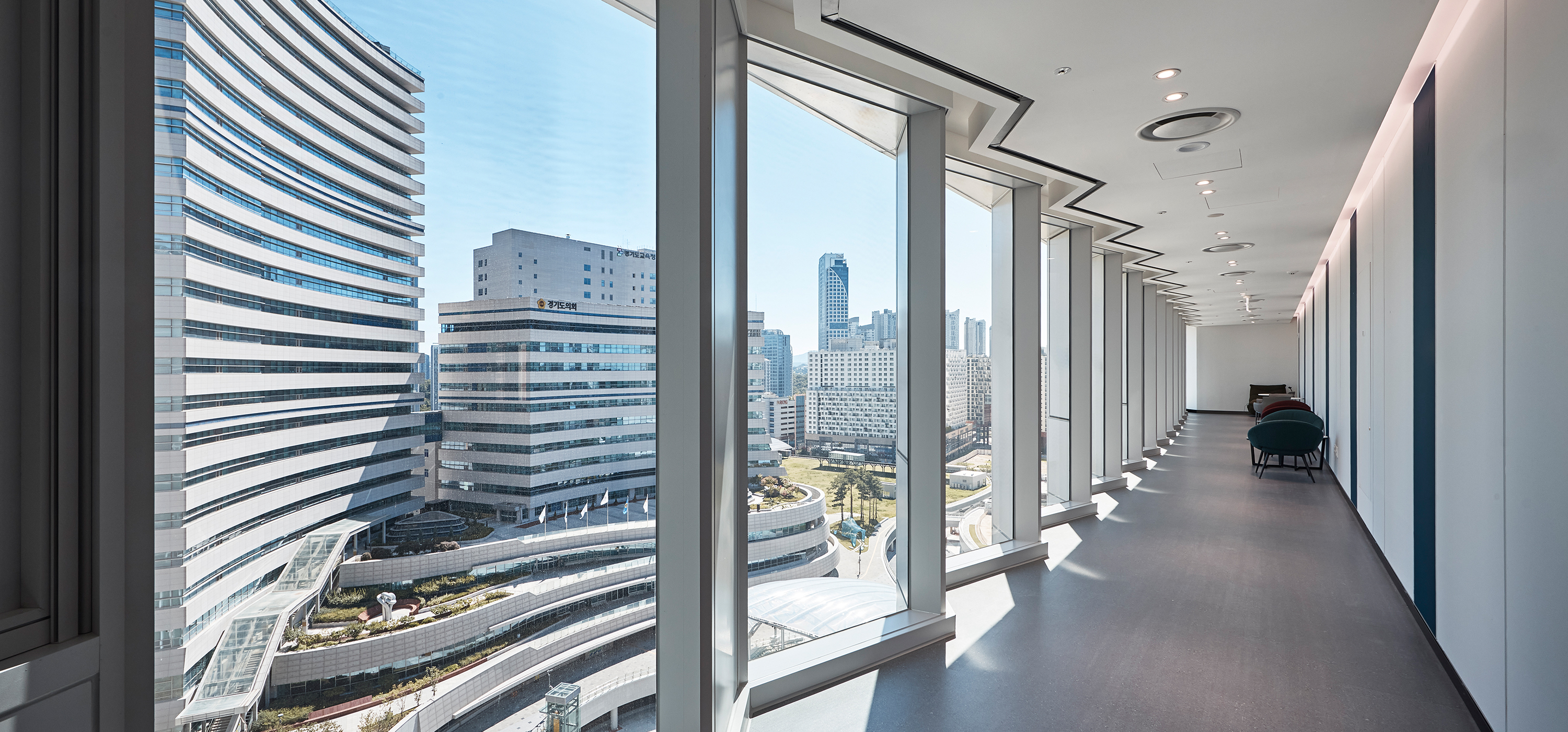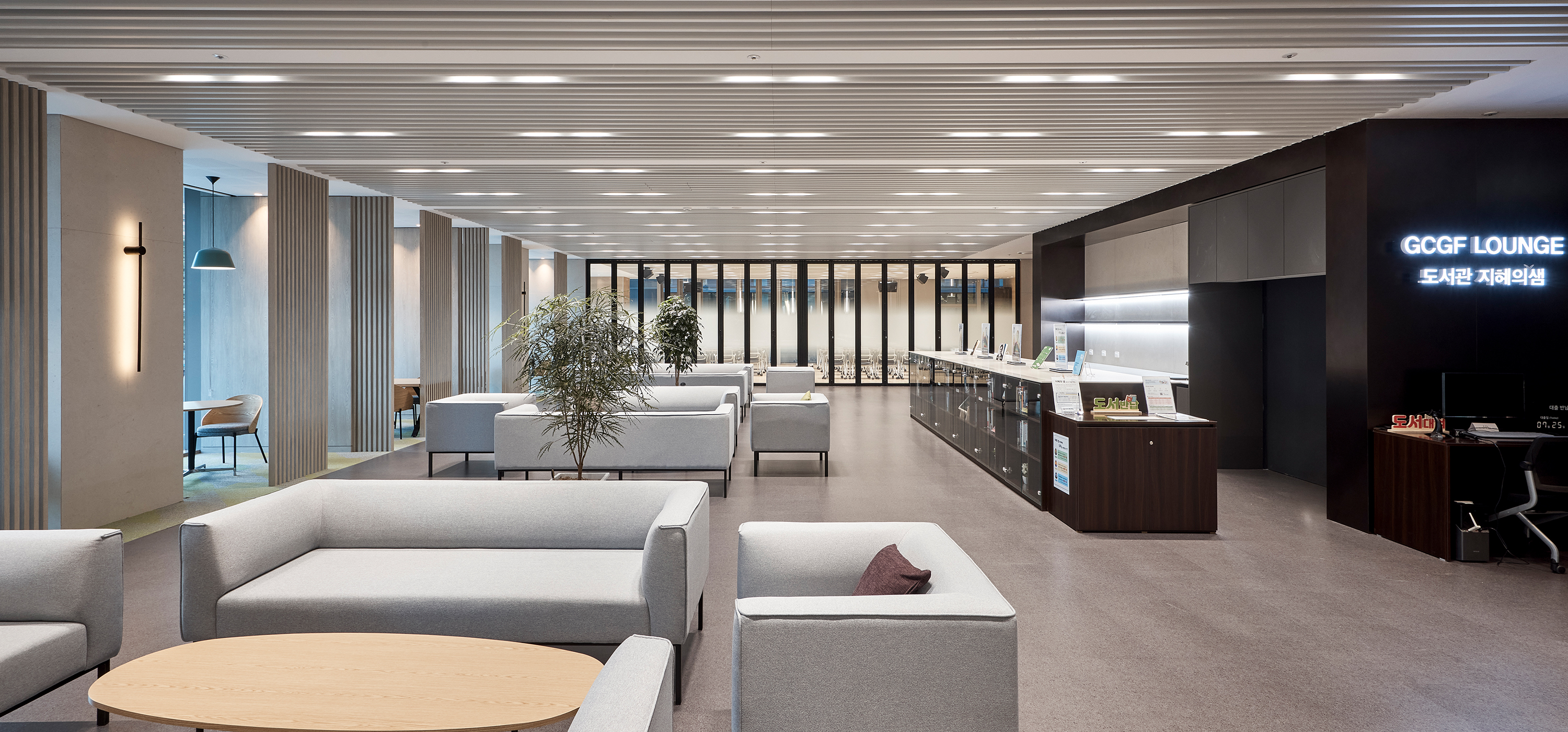 The headquarters of the Gyeonggi Credit Guarantee Foundation was designed in harmony with the Gyeonggi Convergence Town master plan. A gently curved base integrates pedestrian paths, retail, and plazas, creating a lively urban environment, while the tower’s curved form embraces the central square. The grand lobby connects directly to financial and start-up support programs, with terraces linked to amenities such as a café, restaurant, and fitness center, offering greenery and open views. Flexible, column-free office floors support a smart and adaptable workplace, and the serrated façade with BIPV panels enhances energy efficiency and sustainability.