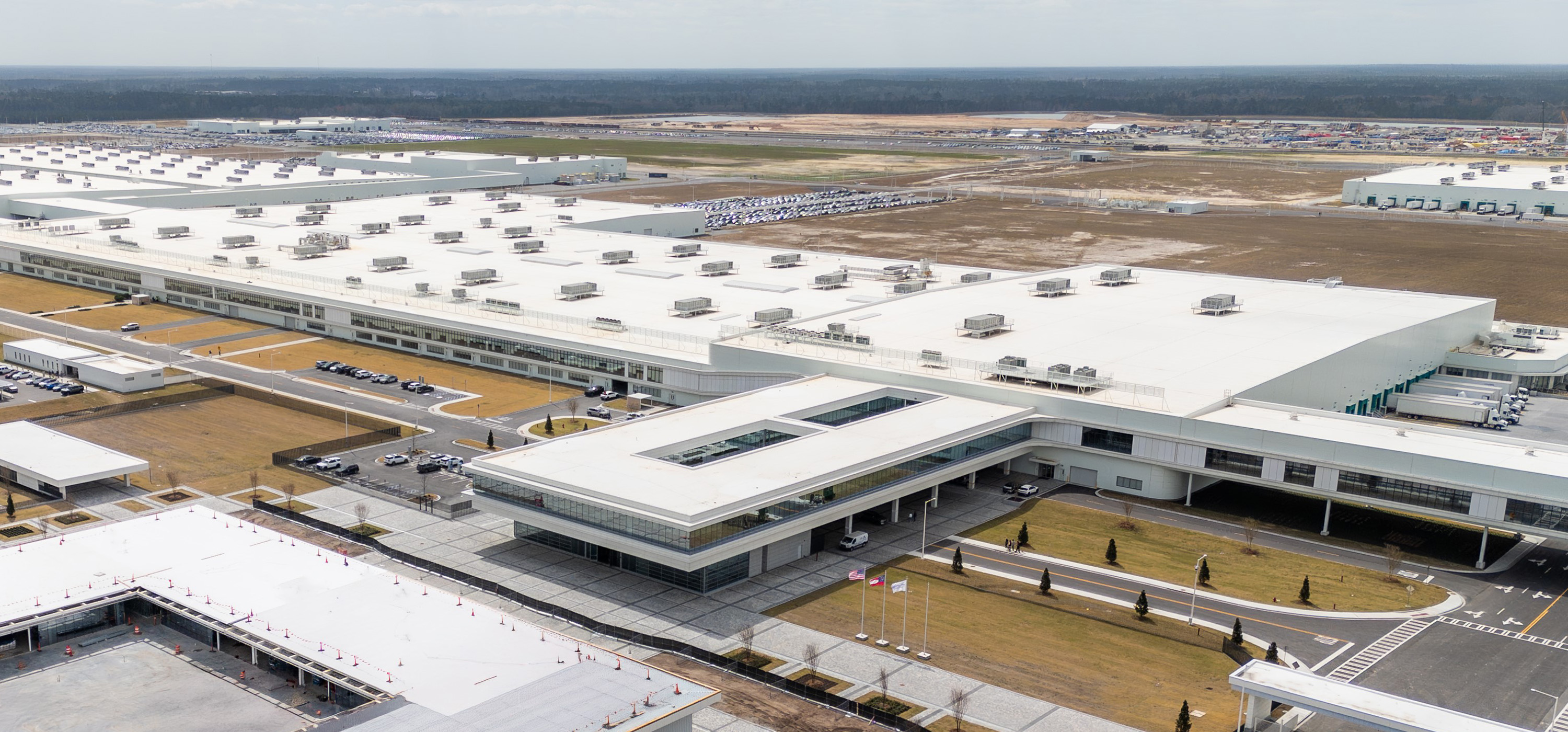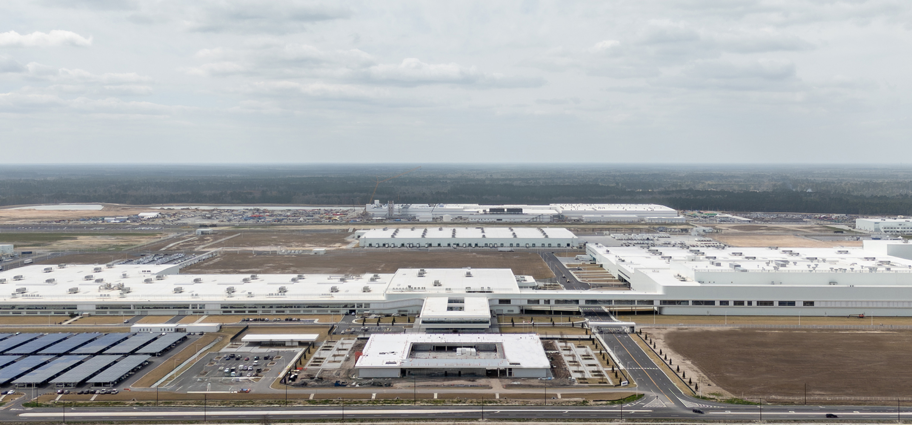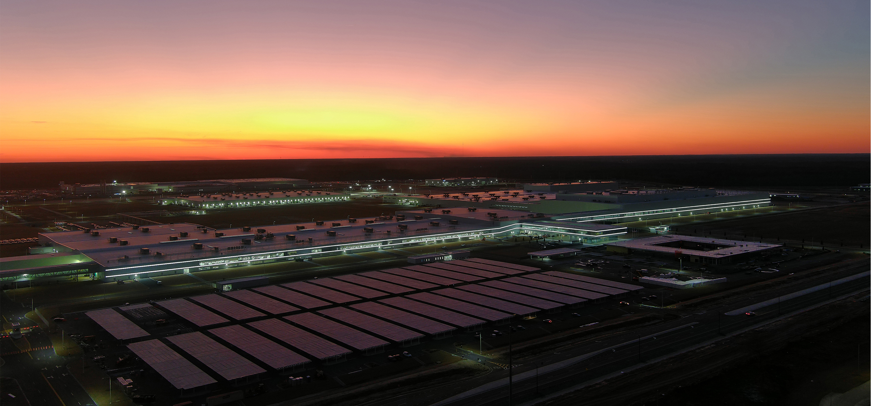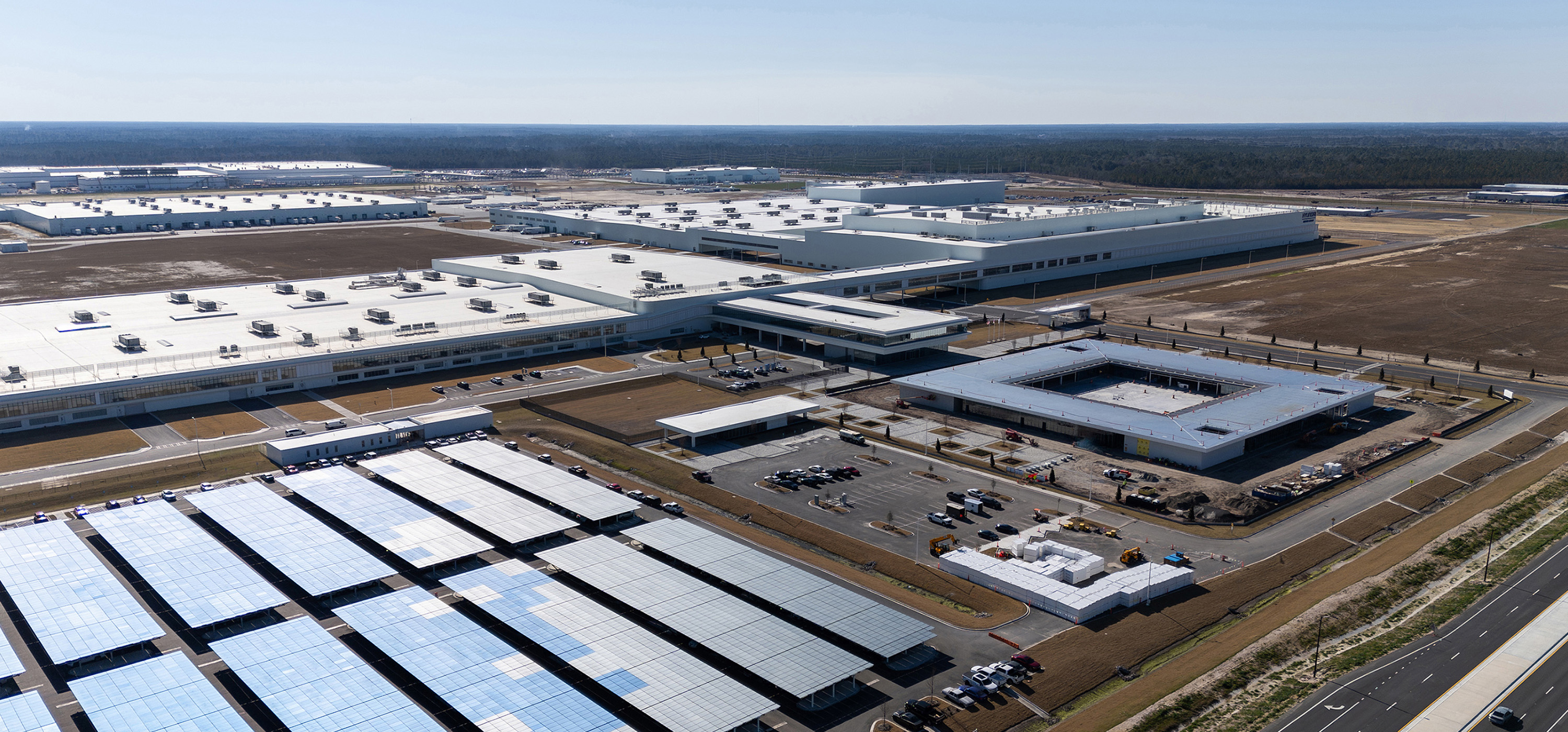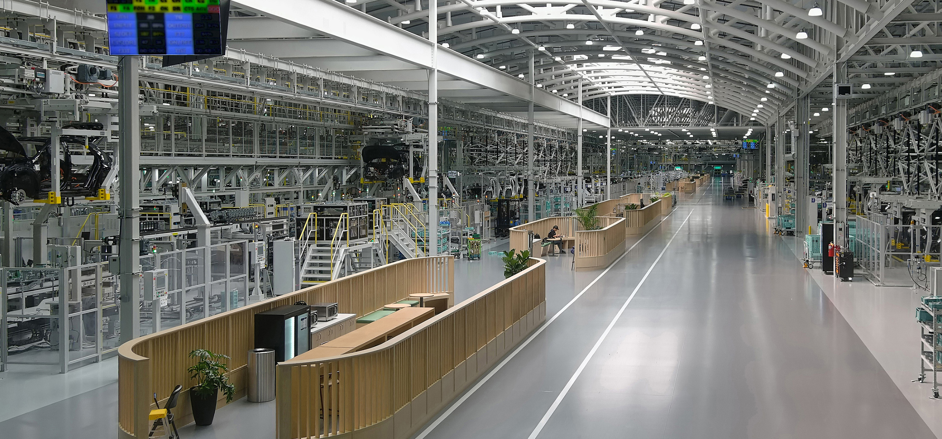 HMGMA, Hyundai Motor Group’s EV-only production campus in Ellabell, Georgia, is an eco-friendly smart factory that combines advanced automation with a human-centered workspace. Its 900-meter horizontal façade exposes the flow of production, with green panels and softened corners expressing both identity and sustainability. Inside, a “Culture Space” offers daylight and areas for communication, enhancing worker comfort. Solar panels above the parking lot supply renewable energy, while an adjacent Ecological Park forms a landscape where industry and nature coexist.