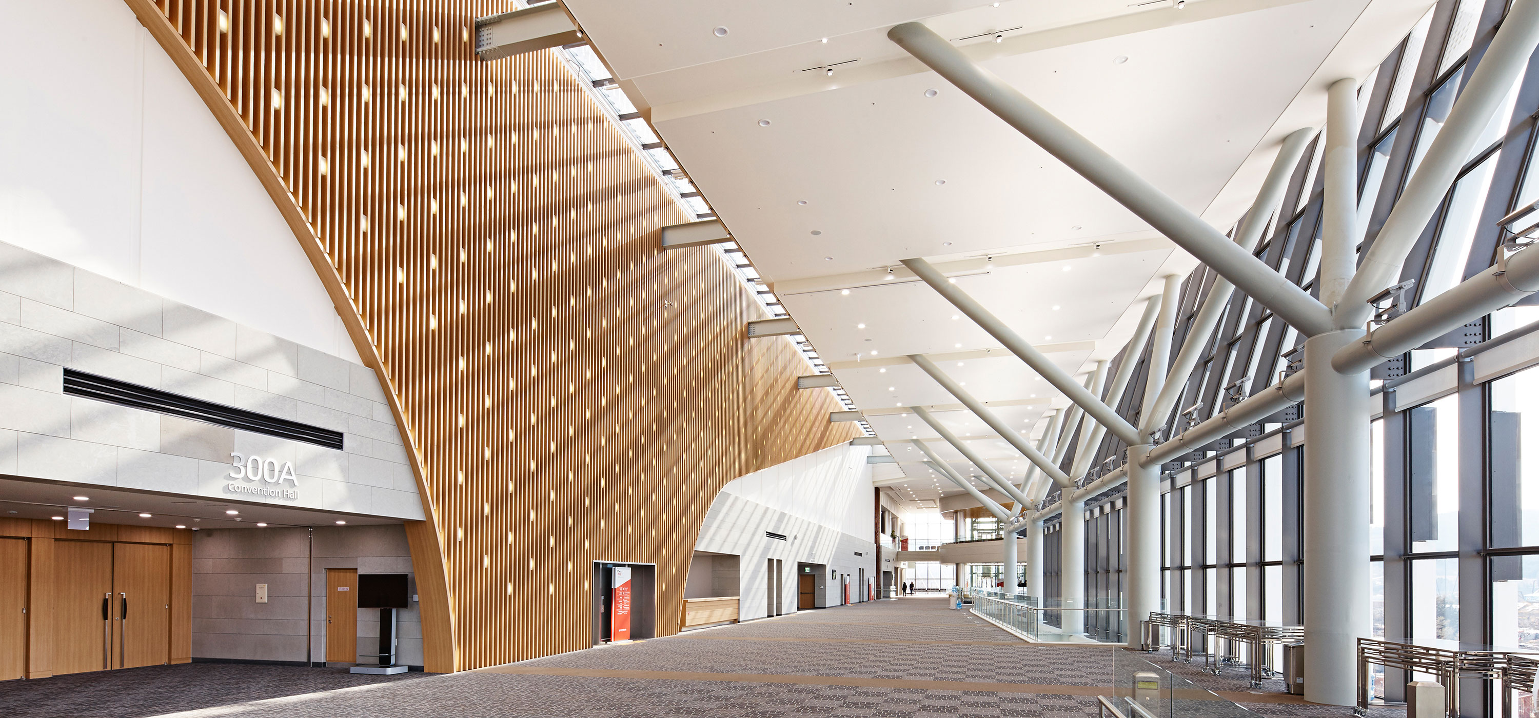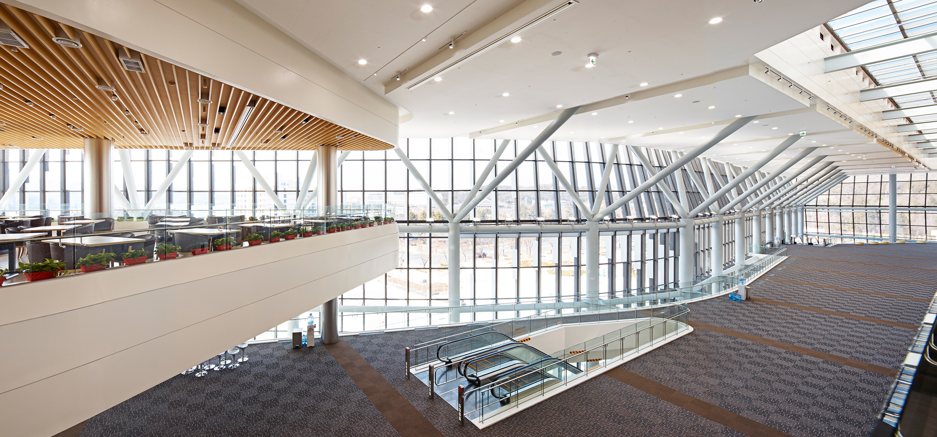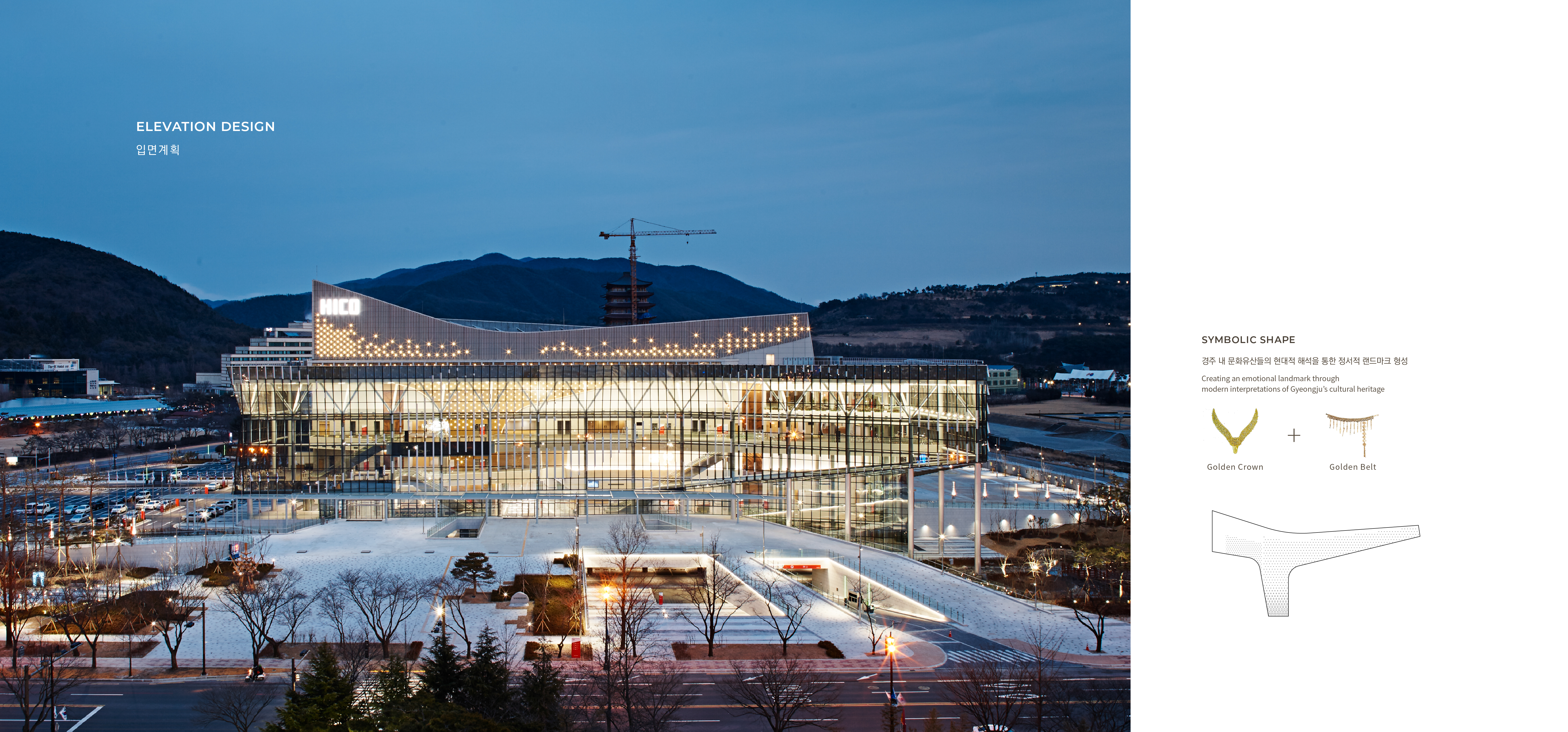 This building is a convention facility connected to the tourist infrastructure of Bomun Complex of Gyeongju, and reflects the high demands of a specialized exhibition facility, publicness and specialty. This modern building emphasizes the dynamic motive of leaping into a new millennium of Gyeongju, and metaphorically reflects the traditional patterns. The exterior space is extended out from linking it with surrounding spaces. It is designed to realize Green Convention of low energy consumptive facility by integrating with various eco-friendly elements and utilizing new regenerated energy.